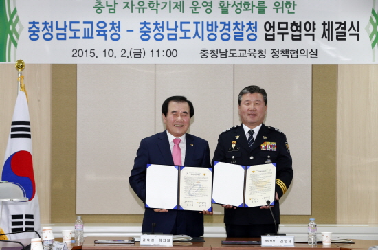 충남도교육청(교육감 김지철)과 충남지방경찰청(경찰청장 김양제)은 2일 본청 정책협의실에서 양 대표를 중심으로 18명이 참석한 가운데 자유학기제 업무협약을 체결했다.