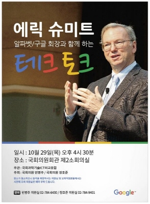 이번 토론회는 구글의 회장에서 ‘알파벳’이라는 지주회사를 설립하여 대대적인 조직을 개편한 에릭슈미트가 알파벳 회장으로 직함이 바뀐 뒤 처음 국회를 방문하여 미래의 컴퓨팅 시대에 대해 전망하고 행사에 참석한 청중들과 이야기를 나눌 예정이다.