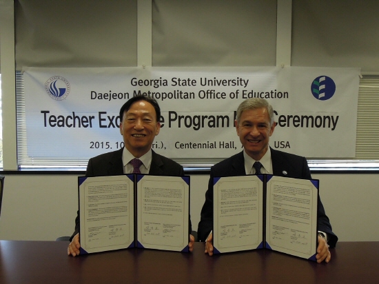 설동호 대전광역시 교육감이 30일 미국조지아 주립대학교 센테니얼 홀에서 Dr. Mark P. Becker 조지아주립대학교 총장과 교사 및 학생 국제교류에 관한 양기관 Mou를 체결했다.