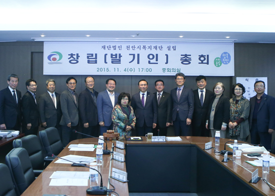 충남 천안시가 4일 오후 시청 7층 중회의실에서 구본영 시장과 12명의 발기인이 참석한 가운데 지역주민들의 복지욕구를 충족시키고 다양한 복지수요에 대응해 나가기 위해 추진해 왔던 재단법인 천안시복지재단 설립을 위한 창립총회를 가졌다.