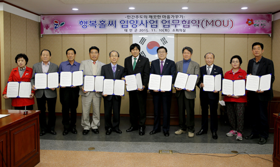 충남 태안군이 지역 기관·단체들과 ‘행복홀씨 입양사업 업무협약(MOU)’을 체결하고 민간 주도의 마을 가꾸기 사업에 나섰다. 군은 지난 10일 군청 소회의실에서 한상기 군수를 비롯, 지역 10개 기관·단체 대표 등 10여 명이 참석한 가운데 ‘행복홀씨 입양사업 업무협약식’을 갖고 ‘청정 태안’ 구축을 위한 생활환경 개선의 첫 발을 내디뎠다.