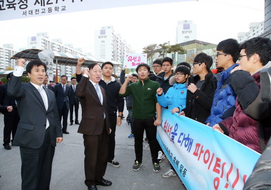 설동호 대전교육감이 12일 오전 서대전고등학교를 방문, 수험생 및 수험생을 응원하러 온 후배 학생들을 격려했다.