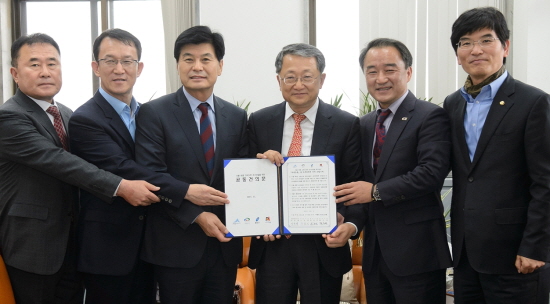 ▲ 이춘희 세종시장이 지난 16일 천안․용인․안성시와 함께 김재경 예산결산특별위원장을 만나 서울~세종 고속도로 건설 사업을 촉구하는 시민 서명부와 공동건의문을 전달하는 모습.(사진 왼쪽부터) 김기영 천안시 안전건설도시국장, 조청식 용인시 부시장, 이춘희 세종시장, 김재경 예결위원장, 황은성 안성시장, 박완주 새정치민주연합 의원(천안을)