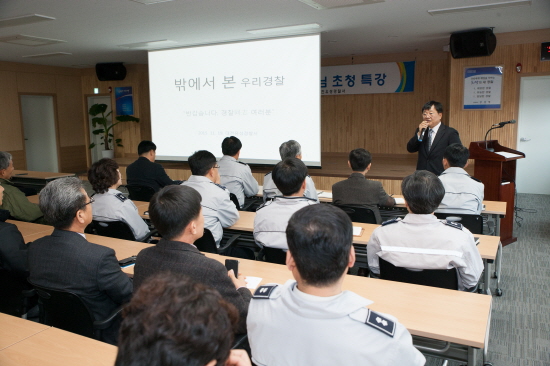 대전유성경찰서가 19일(목) 오전 경찰서 5층 대회의실에서 조용연 前 충남지방경찰청장을 초청, “밖에서 바라본 우리 경찰”이라는 주제로 특별강연을 듣는 시간을 가졌다.