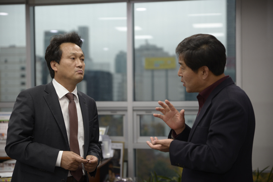 ▲ (왼)안민석 예결위 간사(오)황명선 논산시장이 대화를 나누고 있다.