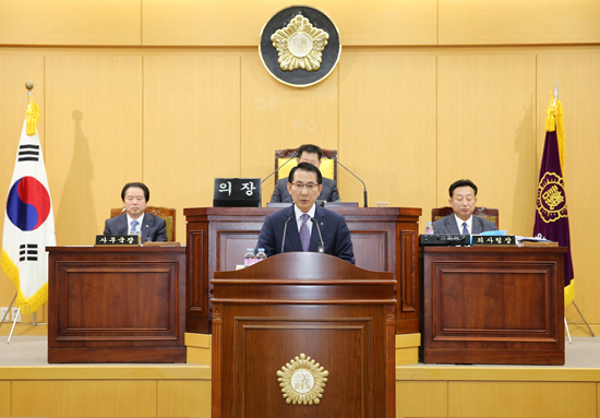 ▲ 이완섭 서산시장이 제206회 서산시의회 제2차 정례회에서 시정연설을 하고 있다.