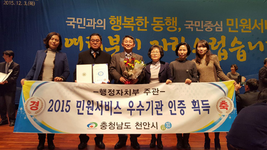 ▲ 충남 천안시가 행정자치부로부터 2015년도 민원서비스 우수기관 인증 지자체로 선정돼 3일 민원공무원의 날 행사에서 인증서를 받았다.