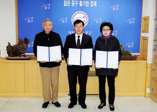 대전 중구가 8일 자원봉사 활성화를 위해 계룡문화@ 가족봉사단(회장 이훈구) 및 중구자원봉사센터(센터장 이옥화)와 구청 구민사랑방에서 ‘사랑해요! 중구 아파트 가족봉사단 업무협약’을 체결했다.