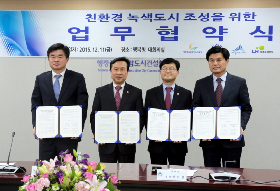 행복청과 산림청, 세종시, 한국토지주택공사(LH) 세종특별본부가 11일 오후 정부세종청사 행복청 종합사업관리상황실에서 행정중심복합도시(이하 행복도시)를 대한민국의 대표적인 친환경 녹색도시로 조성하기 위한 업무협약(MOU)을 체결했다.