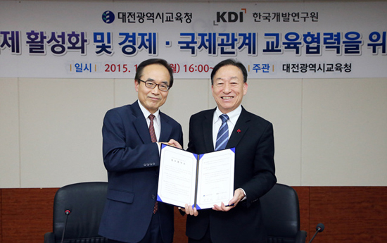 대전광역시교육청이 14일 오후 대전시교육청 6층 중회의실에서 한국개발연구원(KDI)(원장 김준경)과 자유학기제 활성화 및 경제‧국제관계 교육 협력을 위한 업무 협약을 체결했다.