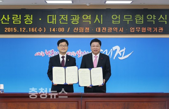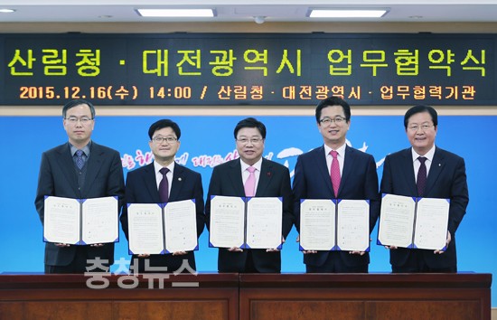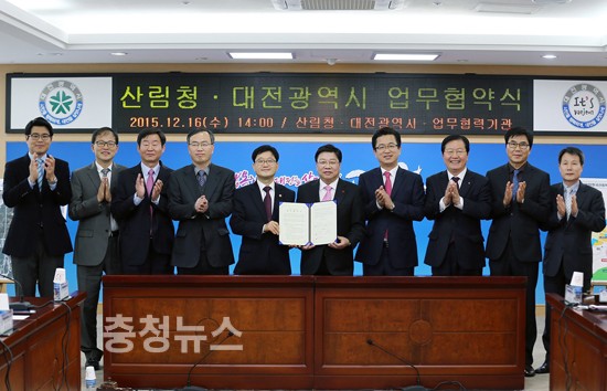 대전시와 산림청은 16일(수) 오후 2시 시청 중회의실에서 권선택 대전시장, 신원섭 산림청장을 비롯해 장종태 서구청장, 허태정 유성구청장, 허경태 녹색사업단장 등이 참석한 가운데 한국산림복지진흥원 건립 및 대전나눔숲체원 조성사업 추진을 위한 업무협약을 체결했다.