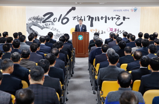김동일 보령시장이 4일 간부공무원을 비롯한 전 직원이 참석한 가운데 열린 병신년 새해 시무식을 통해 △환황해권 명품 해양관광도시로의 도약 △나보다 ‘우리’를 중시하는 공동체 의식 함양과 ‘미소․친절․청결’을 통한 투명하고 바른 행정 △공직자의 질서 있는 원칙과 기준을 통한 균형 발전‘ 등 세 가지를 신년 화두로 제시하고 강력하게 추진할 것을 주문했다.