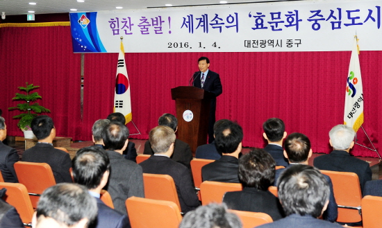 대전 중구(구청장 박용갑)는 4일 구청 대회의실에서 간부공무원 등 250여 명의 직원이 참석한 가운데 ‘2016 시무식’을 개최하고 ‘힘찬 출발! 세계속의 효문화 중심도시’를 다짐했다.