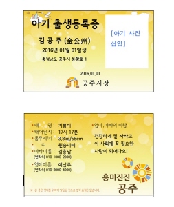 시에 따르면, 이번 아기 출생등록증은 공주시민으로서의 자긍심 고취와 함께 저출산 시대에 가족과 사회에 큰 축복인 아기의 출생을 축하하고 추억을 선물해 줌으로써 출산을 장려하기 위해 기획했다