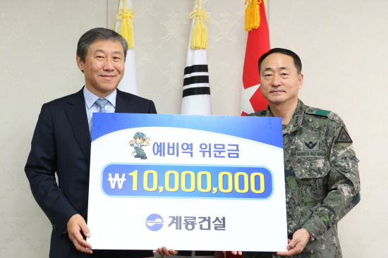 계룡건설은 매년 민족의 최대 명절인 설과 추석을 기해 육군에서 시행하고 있는 ‘와병중인 예비역 위문사업’을 후원해 오고 있으며 지난해 설과 추석 명절에도 각각 1000만원씩 전달한 바 있다.