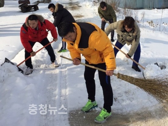 이영찬 타이거짐 대표가 천안 광덕산 등산로 등에서 천안·아산지역 시민들의 건강증진을 위한 생활체육 활성화에 앞장서고 있는 퍼스널트레이너 10여명과 함께 제설작업을 실시했다고 27일 밝혔다.