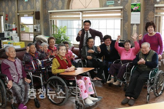 ▲ 최교진 교육감이 세종시행복실버홈요양원(대표 이병식, 가운데)에서 어르신들을 위로, 격려 하고 있다./ 충청뉴스 최형순 기자