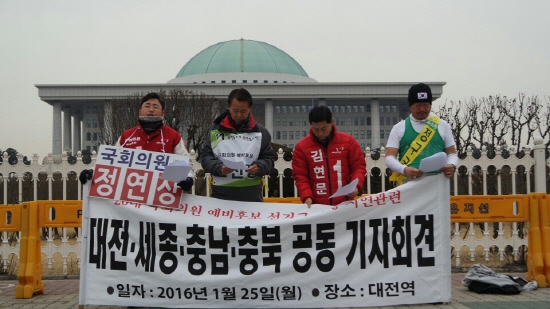 새누리당 정연상 국회의원 예비후보(공주시)와 김현문 예비후보(충북 청원), 무소속 정구국 예비후보(대전 동구), 고진광 예비후보(세종)가  29일 오전 국회의사당 정문 앞에서 공동기자회견을 가졌다