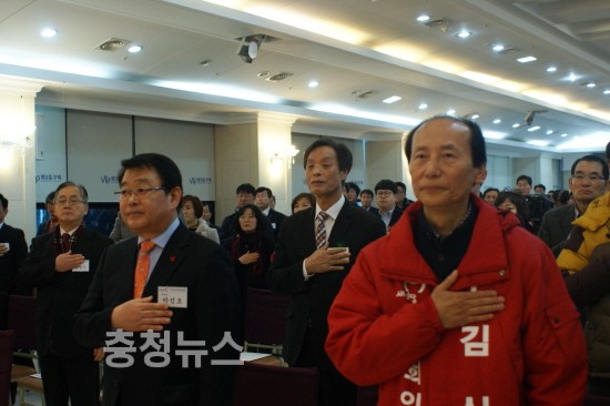 ▲ 오른쪽부터 박희조 사무처장, 박희진 대전시의원. 이규태 예비후보, 김신호 예비후보, 박성효 위원장