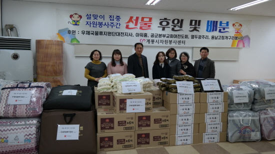 충남 계룡시자원봉사센터는 지난 3일 설 명절을 맞아 우체국물류지원단 대전지사, 아워홈 계룡공장, 열두광주리, 공군본부교회 여전도회, 용남고등학교 청개구리 봉사단 등 20여명이 참여한 가운데 뜻 깊은 후원물품 전달식을 가졌다.
