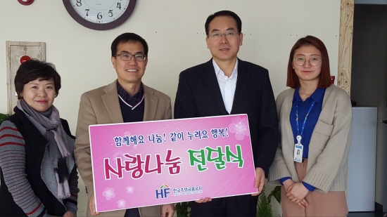 천안시 불당동에 소재한 한국주택금융공사 천안지사(지사장 김익수)는 지난 5일 장애인 생활시설인 ‘사랑의집’을 방문하여 후원품 전달식을 가졌다.