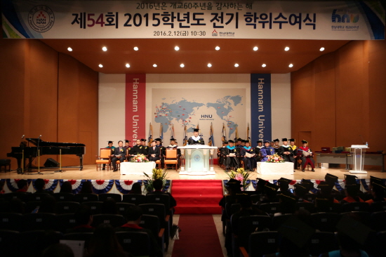 한남대는 12일 오전 10시 30분 성지관에서 ‘2015학년도 전기 학위수여식’을 열고, ▲학사 2,558명 ▲석사 361명 ▲박사 52명 등 총 2,971명의 졸업생을 배출했다.