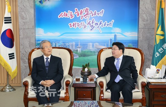 권선택 대전시장이 18일 오후 3시 시청에서 김종인 더불어민주당 비상대책위원장을 만나 대전시의 주요 현안에 대한 의견을 나눴다.