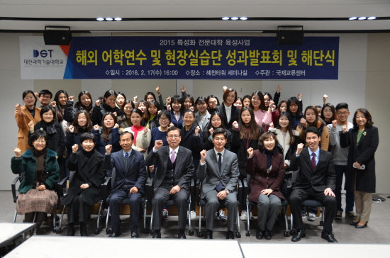 대전과학기술대학교(총장 정영선)는 2015학년도 동계방학 중 재학생들의 글로벌 역량 강화 및 어학 능력 향상을 위하여 실시한 해외 어학연수 및 현장실습 성과발표회 및 해단식을 17일 교내 혜천타워 세미나실에서 개최했다.