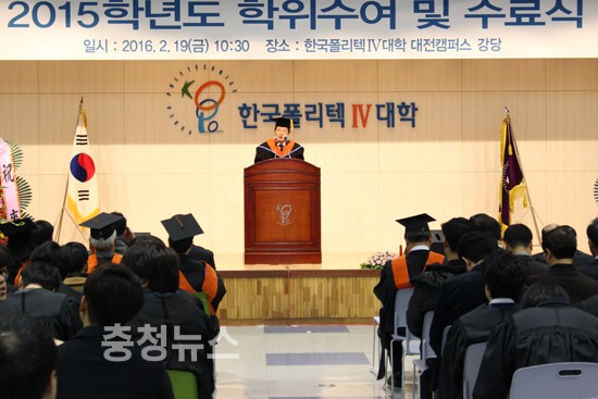 한국폴리텍Ⅳ대학 대전캠퍼스는 19일(금) 본교 대강당에서 엄주천 한국산업인력공단 대전지역본부장, 윤의민 한국장애인고용공단 대전지사장 등이 참석한 가운데 2015학년도 학위수여식을 개최하고 산업학사 430명과 기능사과정 58명에게 학위를 수여했다.