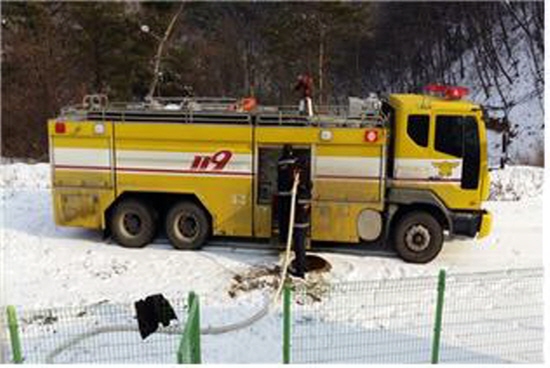 ▲ 1월 한파로 얼어붙은 정안농공단지에 비상공업용수 공급중 (사진제공- 공주시청)