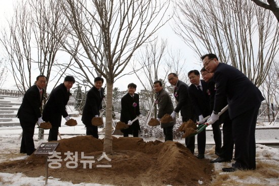 이충재(좌측 다섯 번째) 행정중심복합도시건설청장이 29일세종시 어진동 대통령기록관 전시관 입구에서 열린 무궁화정원(126㎡) 개장식에서 홍윤식 행자부 장관(우측 네 번째), 신원섭 산림청장(좌측 네 번째), 이춘희 세종시장(좌측 세 번째), 이상진 국가기록원장(우측 세 번째), 홍성덕 한국토지주택공사(LH) 세종특별본부장 등 참석자들과 기념식수를 하고 있다.