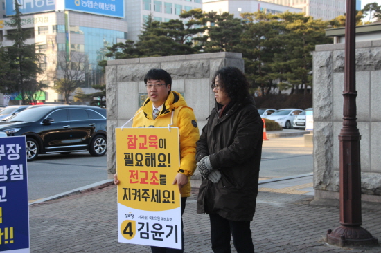 김윤기 예비후보가 전교조 대전지부장에 대한 직권면직 시도를 규탄하는 1인시위를 벌였다.