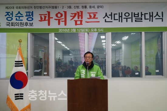 국민의당 천안병 선거구 정순평(59) 예비후보의 파워캠프가 12일 쌍용동 선거사무실에서 선거대책위원회 발대식을 갖고 본격 선거운동에 돌입했다.