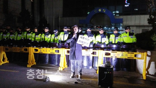 세종시당 최무락 수석부위원장을 비롯한 부위원장들과 시의원 전원, 각급위원회, 지역협의회 위원 등 100여명은 13일 오후 7시쯤 두 대의 버스에 나눠 타고 중앙당 비대위 회의장 앞에서 항의 시위를 강행하고 있다.