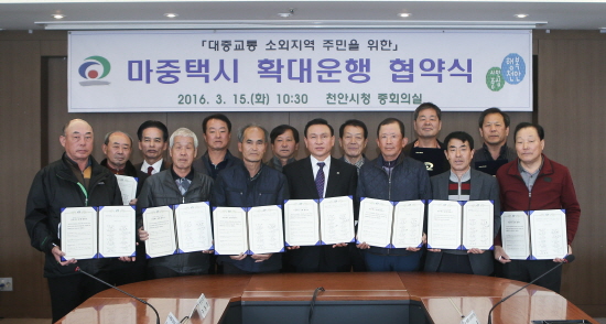 이를 위해 시는 15일 시청 중회의실에서 천안시와 11개 마을의 대표자, 택시업체 대표 등이 참석한 가운데 마중택시 확대운행에 대한 상호협력을 위한 협약식을 가졌다.