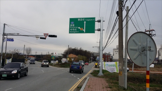 율금리 교차로 일원은 도로선형이 불량하고 3지교차로로 인해 교통사고 위험이 높은 지역으로 꼽히고 있다.