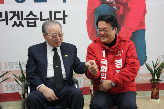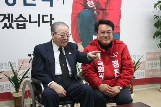 김종필 前 국무총리가 새누리당 공주.부여.연기 선거구에 출마한 정진석 후보를 전격 방문하고 격려했다.