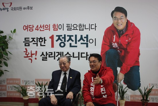 김종필 총리는 22일 정 예비후보를 찾아 “부여가니 정진석 후보 분위기가 좋다”며 같이 동석한 김무환 전 부여군수를 가리키며 “김 군수를 비롯해 전 군수 셋이 다 정 후보의 좋은 소식만 전했다”고 말했다.