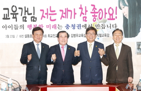 충청권 4개 시도 교육감들이 23일(수) 세종시교육청에서 만나 아이들의 행복한 미래를 충청권에서 만들겠다는 뜻을 모으고 후속조치로 충청권교육감정책협의회 운영, 충청권학교혁신네트워크 운영, 충청권 공동 연구 사업 진행에 대해 협의했다.