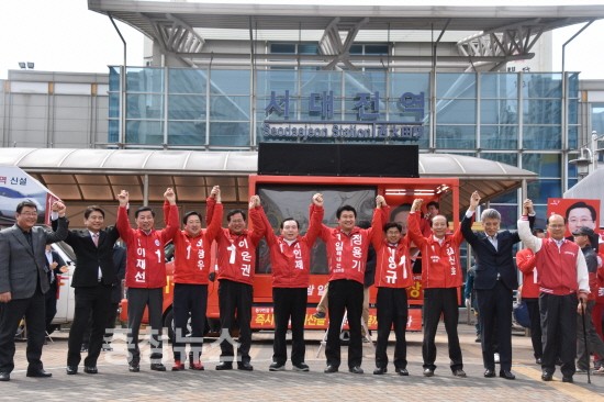 새누리당 대전시당 후보자들이 충청인 우롱 규탄 및 KTX 증편ㆍ직선화 결의대회를 열고 "지역 현안문제에 무관심으로 일관한 무능한 야당을 심판해달라"고 목소리를 높였다.