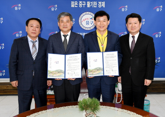 대전 중구(구청장 박용갑)와 한국일보 대전총괄본부(본부장 최정복)는 7일 구청장 집무실에서 중교로 차없는 거리 토요문화마당 활성화와 미스코리아 대전충남 예선대회의 성공적인 개최를 위한 업무협약식을 가졌다.