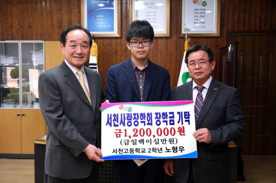 충남 서천군 노박래 군수와 김중원 서천사랑장학회 이사장이 참석한 가운데 열린 장학금 기탁식에서 서천고등학교 2학년에 재학 중인 노형우군은 후배들을 위해 써 달라며 제16회 서천사랑장학회 장학금으로 받았던 120만원 전액을 기탁해서 화제다.