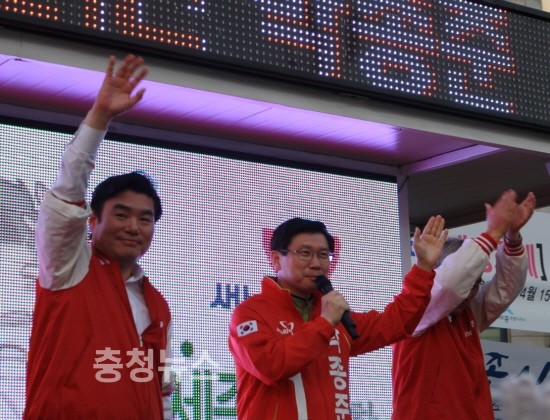 원유철 새누리당 원내대표가 8일 세종시 조치원 역전을 찾아 시민들과 함께하고 박종준 후보의 유세를 지원했다.