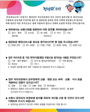 주요 내용은 공무원들이 업무를 친절하고, 적극적이고 투명하게 처리하고 있는지, 제공 받은 행정서비스 만족도는 어떤 수준인지, 금품이나 향응을 요구하거나 제공한 적이 있는지, 개선사항은 어떠한 것들이 있는지 등 5개 문항으로 이뤄졌다.