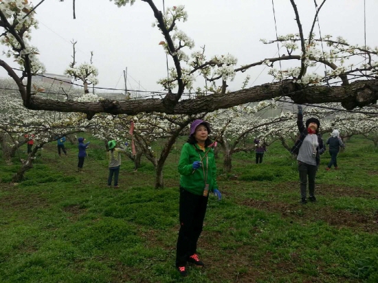 충남 천안시농업기술센터(소장 강성수)에서 운영중인 천안시농업대학 소비자과정 수강생 24명은 4월 14일 천안시 부성동 소재의 농장에서 천안배가 안정적으로 열리게 하기 위한 배꽃 인공수분작업을 실시했다.