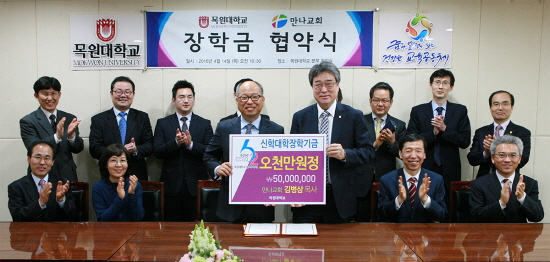 목원대학교(총장 박노권)는 14일(목) 오전 10시 30분에 대학본부 회의실에서 경기도 성남시 분당구에 위치한 만나교회 김병삼 담임목사와 장학위원회 회원들로부터 연간 일천만원씩 5년간 오천만원의 ‘만나 장학금’을 전달받기로 협약하였다.