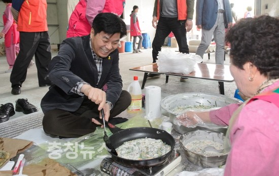 ▲ 이춘희 세종시장이 주민과 함께 전을 부치고 있다.