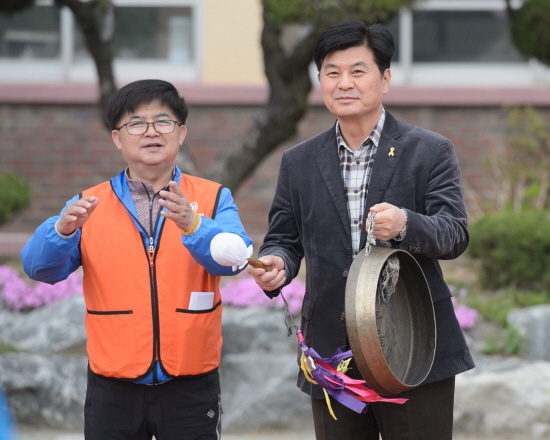 ▲ 제21회 시민화합 건강걷기대회에서 이춘희 세종시장이 출발을 알리는 징을 치고 있다./ 충청뉴스 최형순 기자