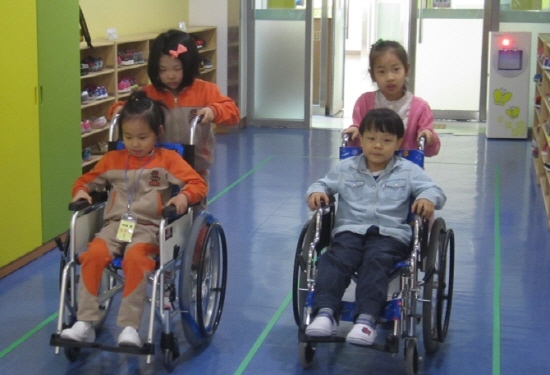 한솔유치원(원장 조계숙)에서는 유아기부터 어린이들에게 장애에 대한 올바른 이해를 심어주기 위해 흰 지팡이로 걸어보기, 휠체어 타보기, 구족화 그리기 등 시각 장애와 지체장애에 대한 체험 행사가 진행됐다.