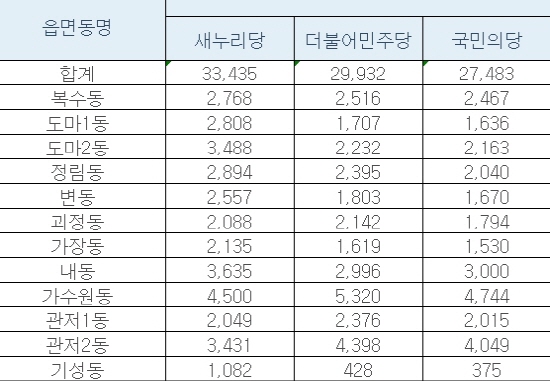 동(洞)별 정당투표 현황을 살펴보면 새누리당은 복수동, 도마동, 정림동, 변동, 가장동, 내동, 기성동에서 앞섰으며 더불어민주당은 괴정동, 가수원동, 관저동에서 강세를 보였다.
